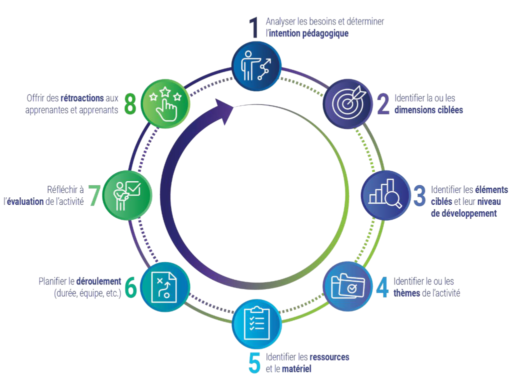 Pour concrétiser la démarche de conception pédagogique, le document propose huit pistes de planification s’articulant autour d’une représentation graphique en huit étapes illustrant un cycle complet, allant de l’analyse des besoins à la réflexion sur l’évaluation et aux rétroactions.