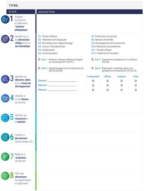 Un gabarit de planification détaillé est également fourni dans le document pour faciliter la création d’activités en classe.